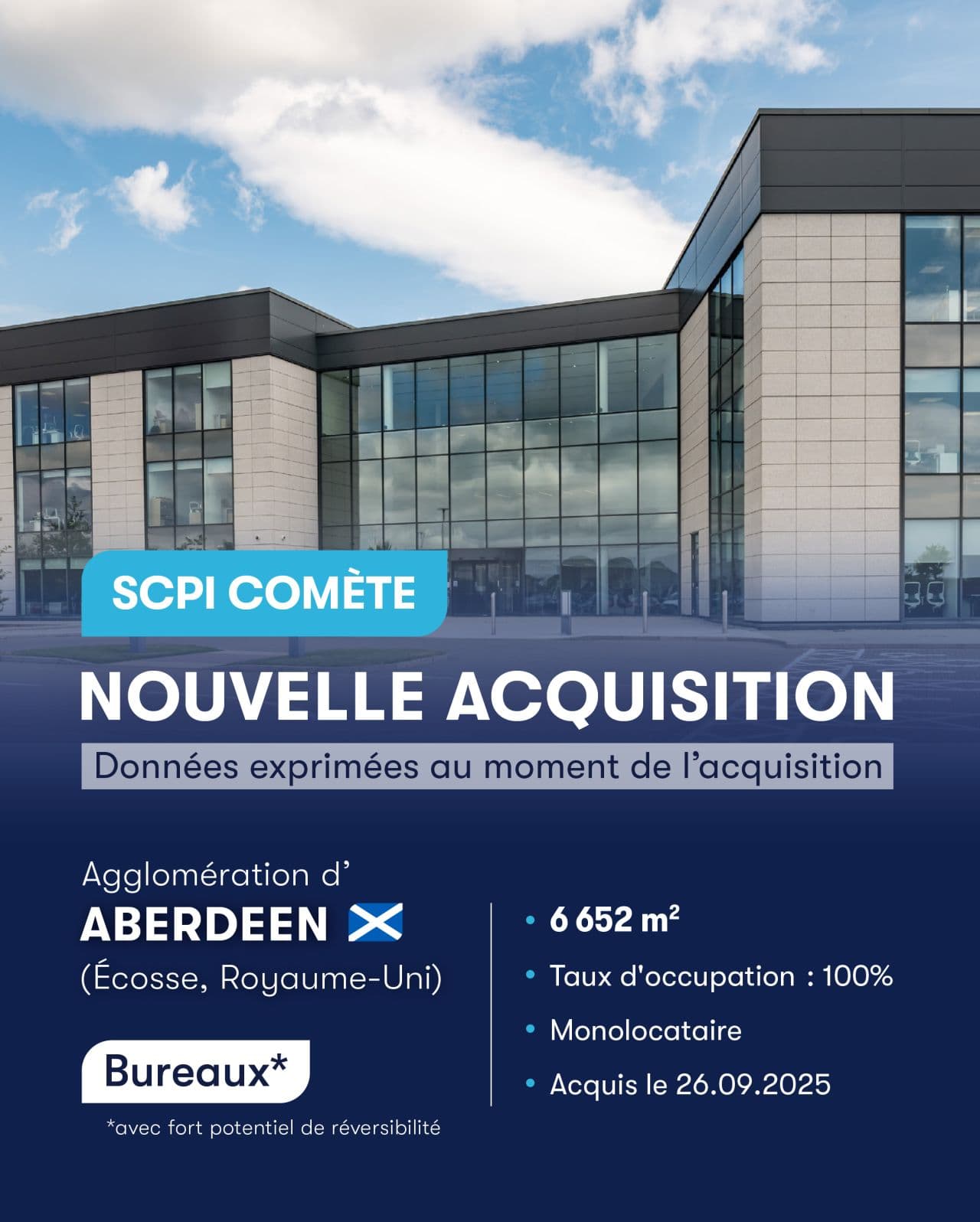 Alderan annonce une nouvelle opération pour la SCPI Comèteavec l’acquisition d’un immeuble de 6 652 m² de bureaux, entièrement loué à un seul occupant. Cette transaction s’inscrit dans la stratégie européenne de la SCPI : viser des actifs offrant à la fois solidité locative immédiate et leviers de création de valeur (réversibilité, repositionnement, et arbitrage futur possible).